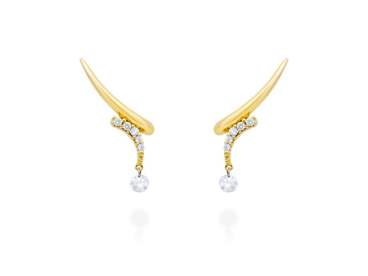 Pendiente inspirado en la arquitectura asimétrica del mirador The Edge. Marina reinterpreta esta estructura en un diseño trepador que desciende con elegancia, creando una caída espectacular que enmarca y realza el óvalo del rostro.